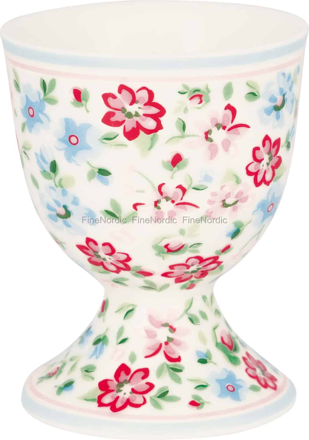 Let the gentle charm of the Louisa White collection brighten your mornings. Inspired by the quiet beauty of a garden in bloom, this exquisite egg cup from GreenGate turns a simple breakfast into a cherished ritual. Each floral detail, from the vibrant red blossoms to the soft blue forget-me-nots, is scattered across the smooth ceramic surface, creating a tapestry of colour that feels both fresh and nostalgic. The delicate stripes of pale pink and blue at the rim and base provide a perfect, considered finish.