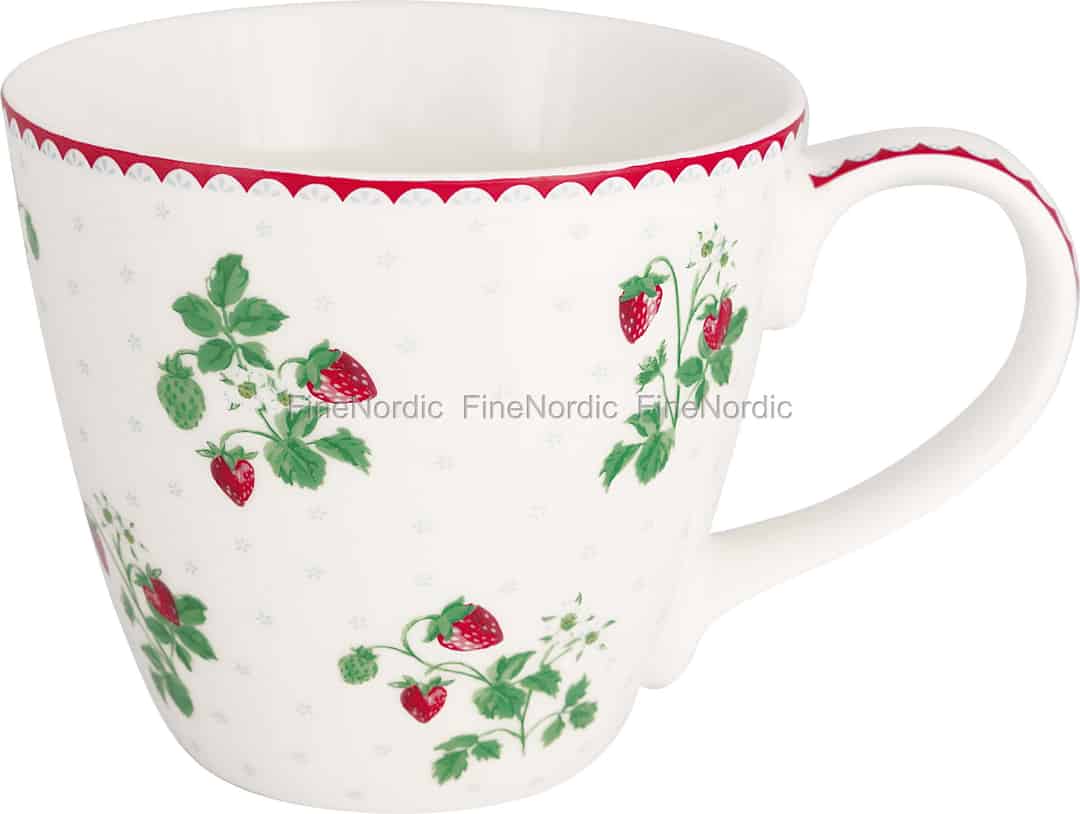 Let the Berry White mug transport you to a quiet corner of a Danish summer cottage, where wild strawberries grow freely. Every detail, from the ripe red berries and delicate white blossoms to the cheerful green leaves, is rendered with GreenGate's characteristic warmth and charm. The design is a celebration of nature's simple pleasures, a story of long, light-filled days and the sweet taste of freshly picked fruit. The subtle light blue pattern in the background adds a touch of depth, like a clear summer sky peeking through the foliage.