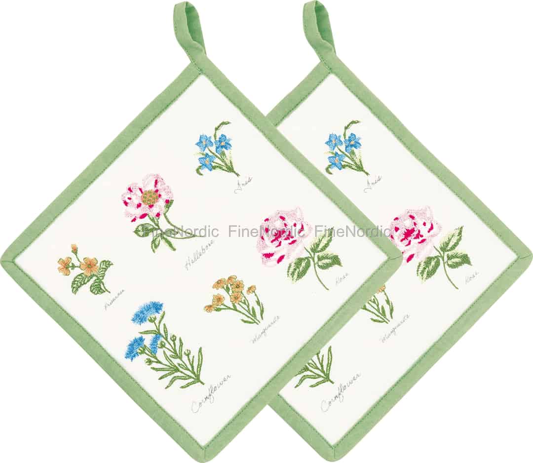The Agnes White collection from GreenGate is like a love letter to the timeless beauty of a flourishing garden. This set of pot holders serves as your canvas, showcasing a delicate array of embroidered flora. You’ll find the gentle primrose, the vibrant cornflower, and the classic rose, each one carefully stitched and labelled as if taken from a botanist's treasured sketchbook. The soft, quilted cotton provides a comforting thickness, framed by a fresh green border that completes the idyllic picture.