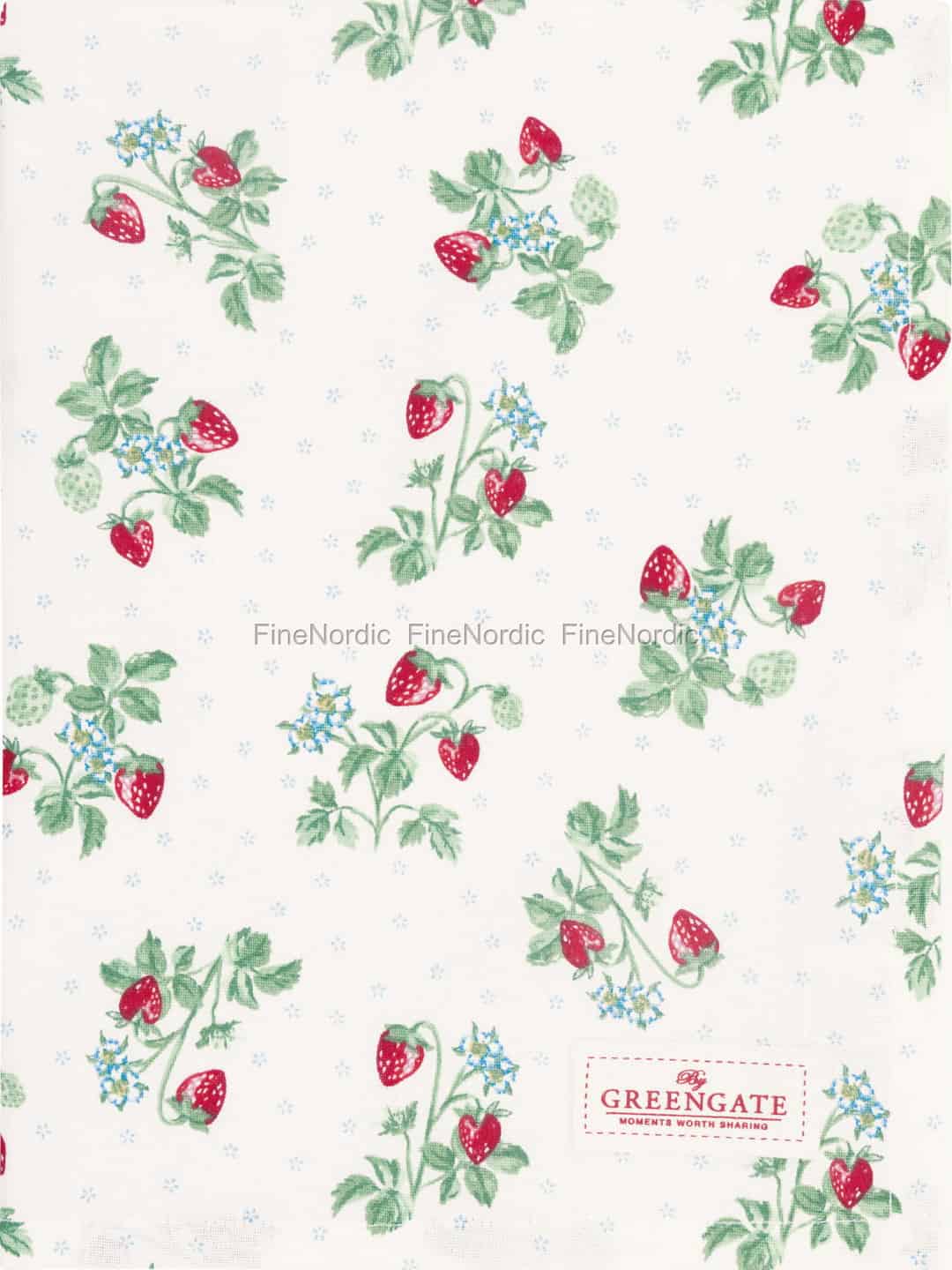 Let the sweet, simple joy of a summer meadow blossom in your home with GreenGate's Berry White tea towel. The design is a tribute to cherished memories of foraging for wild strawberries, with ripe red berries, fresh green leaves, and clusters of tiny blue flowers scattered across a soft, off-white cotton canvas. It’s a classic GreenGate pattern that captures the brand’s philosophy of finding beauty in everyday moments, turning a simple kitchen essential into a small piece of art that tells a story of warmth and nostalgia.