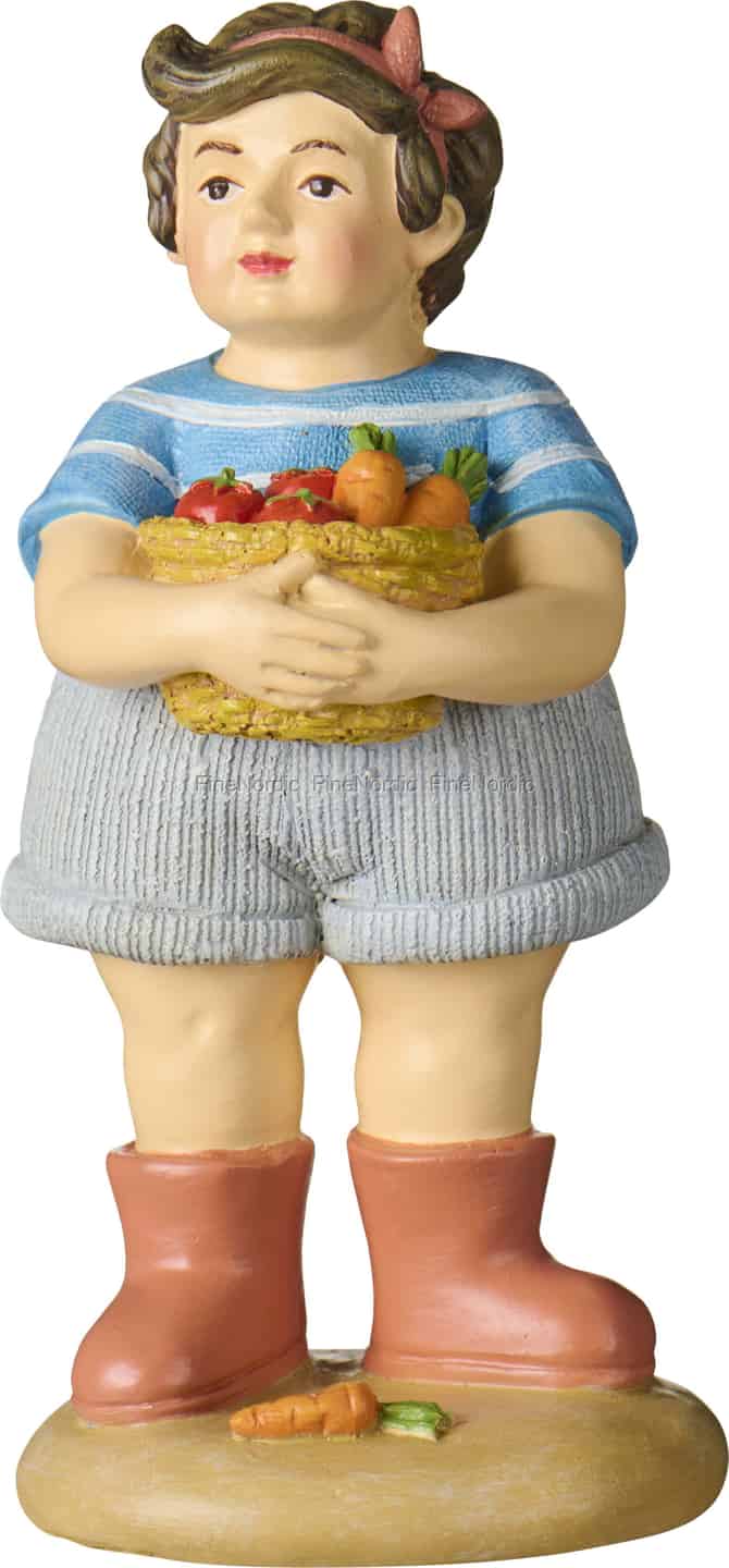 Imagine a gentle afternoon spent amongst the vegetable patches, with the sun warming your shoulders. This endearing figurine from Ib Laursen embodies that peaceful feeling, celebrating the wholesome joy of gathering your own harvest. With rosy cheeks and a basket held close, this little gardener is a picture of contentment, proudly displaying the fruits of their labour—bright red tomatoes and sweet, earthy carrots. The wonderfully textured details, from the striped t-shirt to the sturdy wellington boots, give this character a life and story all of its own.