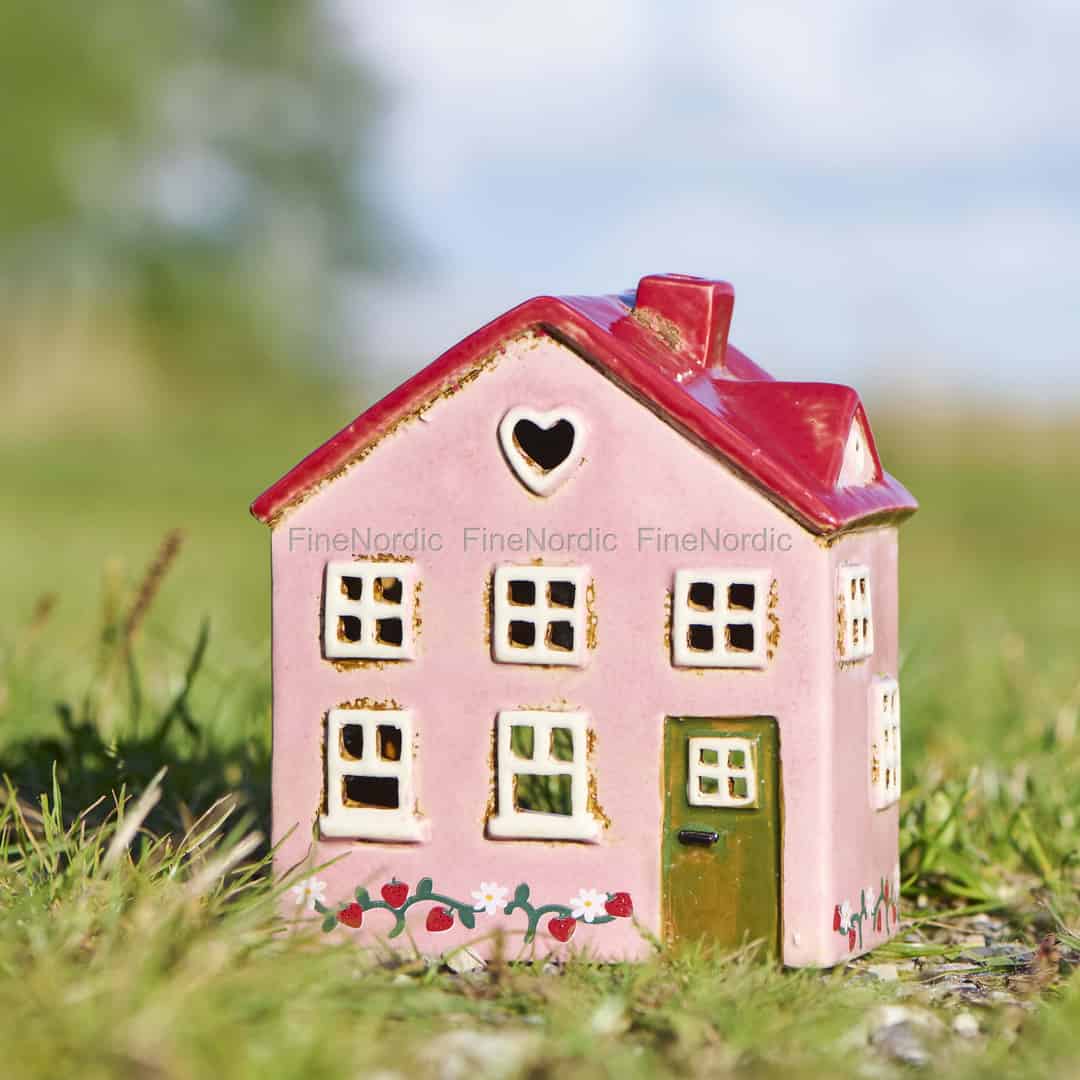 Inspired by the idyllic summer cottages of the Danish town of Ebeltoft, this beautiful tealight house by Ib Laursen is a little piece of Scandinavian charm. The soft pink facade, glossy red roof, and welcoming green door evoke memories of long, sunny days and peaceful evenings. Every detail, from the heart-shaped window in the gable to the hand-painted strawberry vine at its base, is designed to delight and inspire a sense of simple, rustic joy.