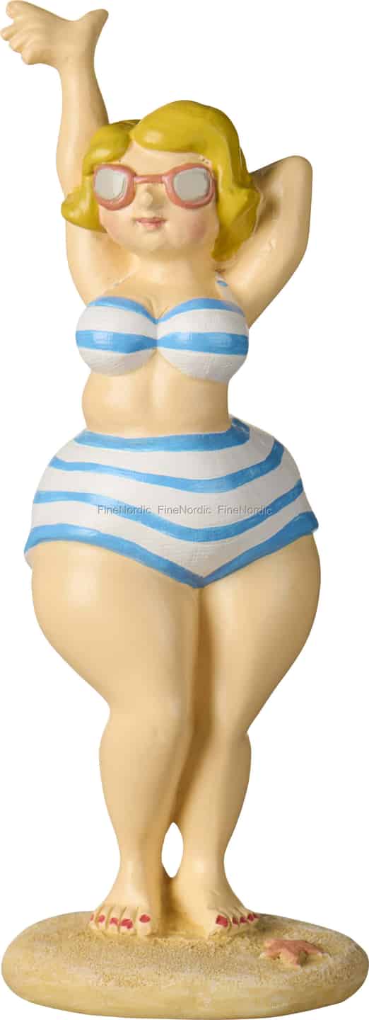 Let this wonderfully confident 'Beach Queen' from Ib Laursen transport you to a sun-drenched Danish coastline. With her arms stretched back in blissful relaxation, she embodies the simple, carefree spirit of a long-awaited summer holiday. Her cheerful blue and white striped swimwear and retro sunglasses evoke a sense of timeless nostalgia, reminding you of lazy afternoons spent by the sea with nothing but the sound of waves for company. She is a small, joyful celebration of soaking up every moment of sunshine.