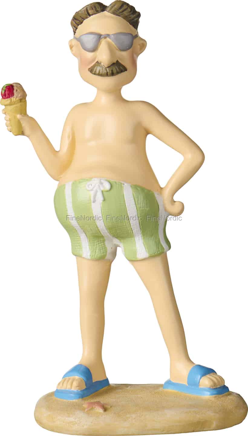 Capture the lighthearted spirit of a blissful day at the coast with this endearing character from Ib Laursen's 'Beach Kings' collection. This fellow, with his proud moustache and fashionable sunglasses, embodies the carefree confidence of someone truly enjoying their holiday. He stands with one hand on his hip, the other holding a precious ice cream cone, a perfect snapshot of simple summer pleasures. The gentle, hand-painted colours—from the soft green of his shorts to the bright blue of his sandals—add to his wonderfully nostalgic appeal.