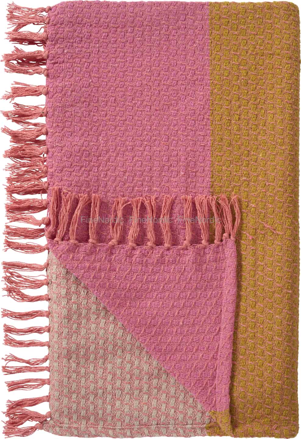 Imagine the soft glow of a setting sun captured in woven cotton. This beautiful throw from Ib Laursen brings a gentle warmth to any space, with its inviting texture and a palette of dusty rose, warm mustard, and natural tones.