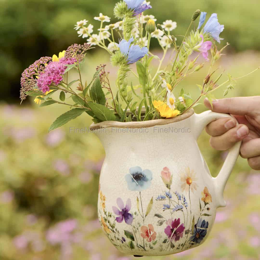 Imagine stepping in from the garden, your hands filled with freshly picked wildflowers. This charming pitcher vase is their perfect home, its rustic design and gentle colours echoing the untamed beauty of a summer meadow.