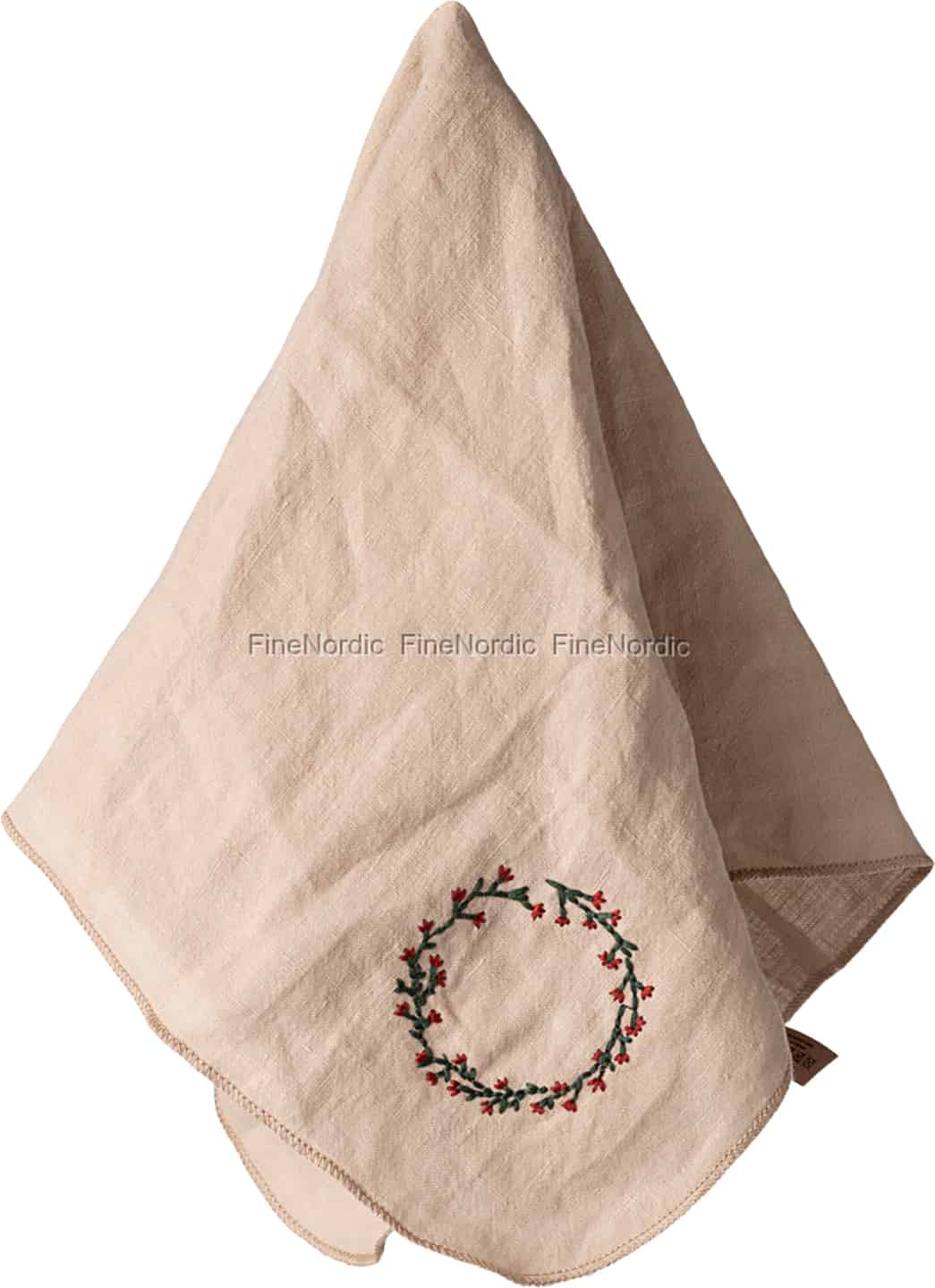 Set a table that tells a story of winter warmth and cherished traditions. This beautiful Maileg napkin, crafted from the softest linen, brings a touch of understated elegance to your festive meals with its delicately embroidered wreath.