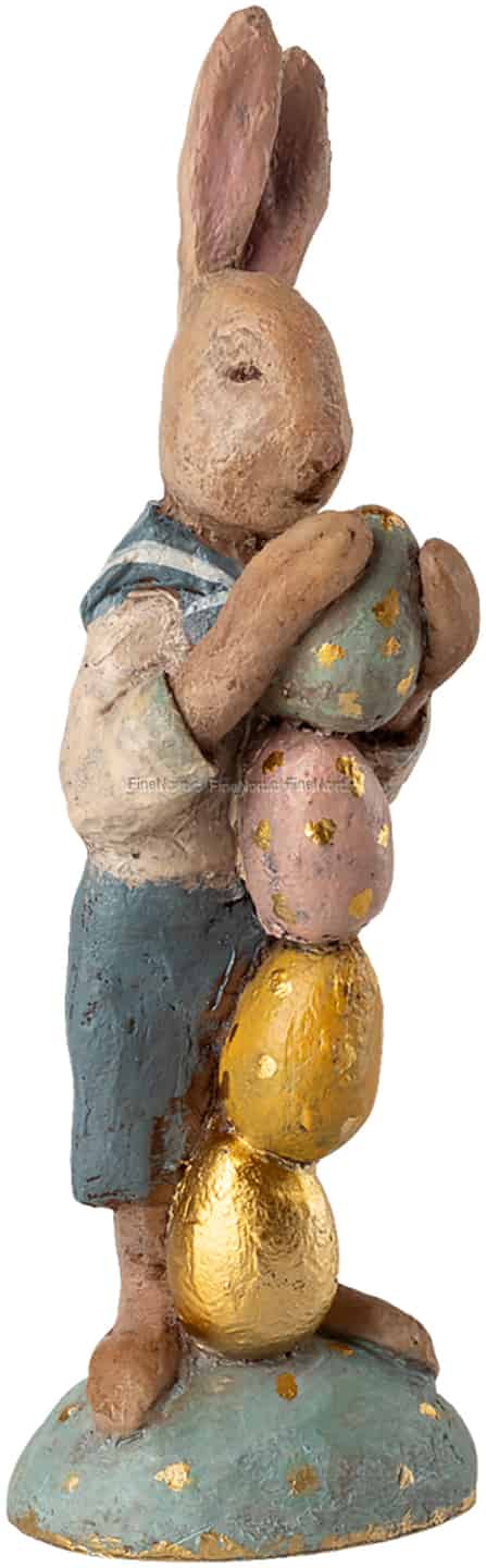 Welcome a little piece of Maileg's enchanting world into your home this Easter. With his sweet sailor collar and an armful of precious, gold-flecked eggs, Bunny No. 12 looks as though he has just hopped out of the pages of a beloved storybook. The rustic, textured finish of the polyresin gives him a timeless, heirloom quality, inviting you to imagine the wonderful tales he could tell. He is not just a decoration, but a character ready to become part of your family's cherished springtime traditions.