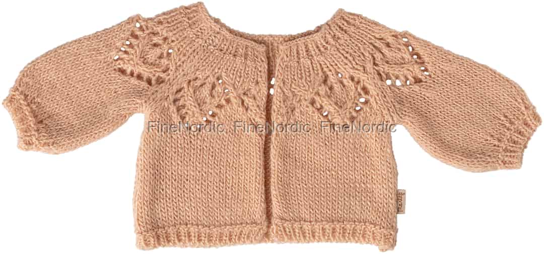 Every detail of this Maileg cardigan is designed to inspire stories. The soft, light rose knit feels wonderfully gentle, and the intricate open-work pattern across the shoulders showcases the thoughtful craftsmanship Maileg is known for. The charming puffed sleeves and classic ribbed hem create a timeless silhouette, transforming a simple outfit into something truly special. It’s a garment that invites you to slow down and appreciate the small, beautiful details that bring imaginary worlds to life.