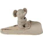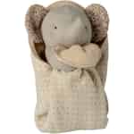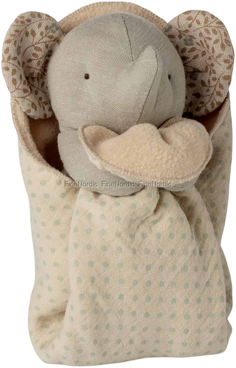 In the magical world of Maileg, even the smallest friends have the biggest hearts. This Lullaby Elephant is imagined as a first confidant, a keeper of tiny secrets whispered just before sleep. Its soft, grey textile body is wonderfully comforting to the touch, while its large ears, lined with a delicate floral print, are always ready to listen. Tucked into its own cosy, polka-dotted blanket pouch, it provides a wonderful sense of security and companionship for your baby.