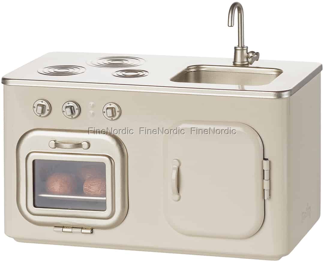 Imagine the comforting scent of freshly baked bread wafting through the Maileg house. This beautifully crafted miniature kitchen, with its charming retro details, is the perfect setting for your little friends to gather, cook, and share stories.