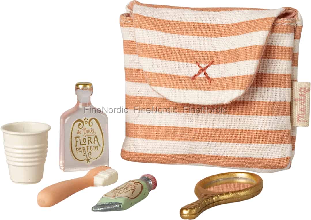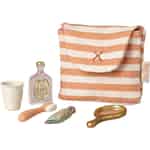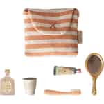 Help your Maileg friend prepare for the day ahead with this enchanting little set. Tucked inside a soft, coral-striped bag, you'll find everything they need for their morning and evening routines, sparking hours of imaginative play.