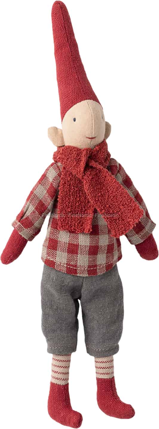 Meet your new Christmas companion, a classic Maileg Pixy brimming with the timeless charm of Danish design. Dressed for crisp winter days in his smart checkered shirt and cosy knitted accessories, he carries the spirit of *hygge* in every stitch. His gentle, embroidered smile and soft, tactile form make him more than just a decoration; he's a tiny keeper of festive secrets and a friend waiting for stories to be told. Imagine him perched on your windowsill, watching the snow fall, or waiting patiently by the fireplace for the Christmas magic to unfold.