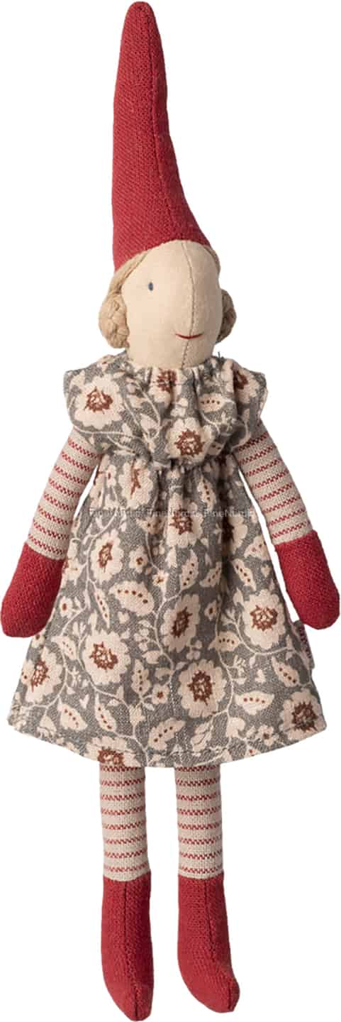 In Scandinavian folklore, pixies (or *nisser*) are beloved guardians of the home, especially during Christmas. This dear girl from Maileg continues that story, arriving ready to fill your home with warmth and wonder. Notice the care in her stitched smile, the neat braids peeking from under her knitted red hat, and the charming floral pattern of her dress. She isn't just a decoration; she is a character waiting for the festive season to begin, a silent keeper of Christmas secrets and joy.