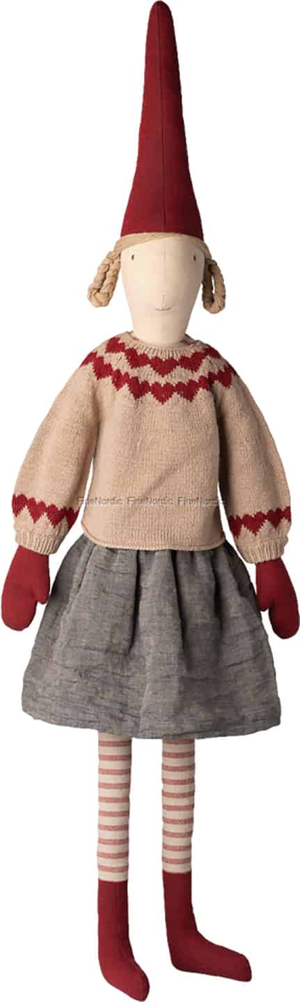 In Scandinavian folklore, the 'Nisse' or 'Pixy' is a treasured household spirit, a quiet helper who looks after the home during the cold winter months. This wonderful Maileg Pixy girl embodies that very tradition, arriving dressed in her finest festive attire to share in the warmth and joy of your home. Her soft, knitted sweater is adorned with hearts, a symbol of the love and togetherness that defines the season, while her sweet, stitched smile offers a gentle welcome to all who pass by.