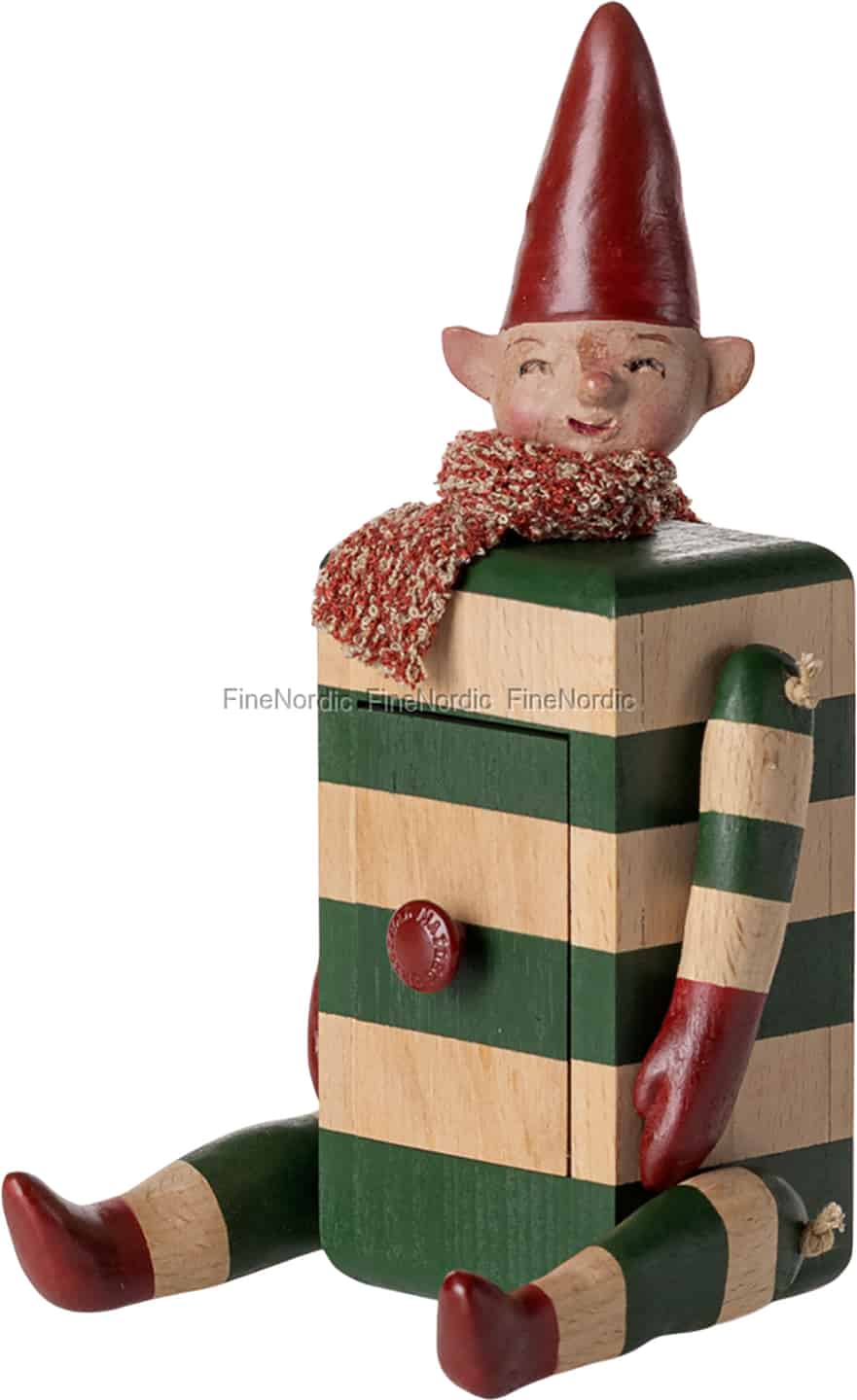 Imagine a cheerful pixy friend watching over your home this Christmas, a gentle smile on its face. This charming wooden character from Maileg brings more than just festive spirit; it holds a tiny secret within its striped green body.