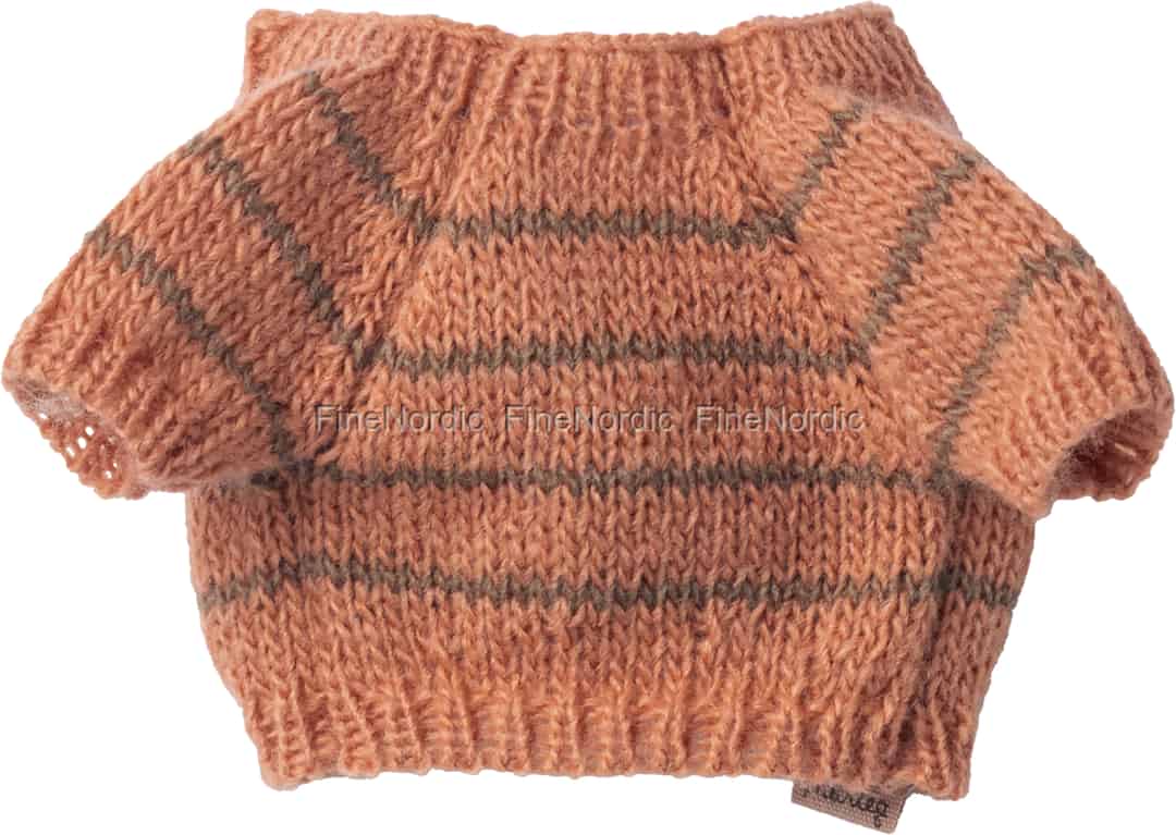 There is a special magic in the small details that bring imaginative worlds to life. With this charming knitted sweater, your little one can dress their cherished Maileg puppy for a stroll through an imaginary park or a quiet afternoon story by the fire. The soft, textured knit feels wonderful to the touch, and the simple act of pulling the sweater over their puppy's head becomes a tender moment of care, nurturing empathy and storytelling. The warm coral colour, accented with soft grey stripes, adds a splash of gentle colour to their collection, sparking new tales and adventures.