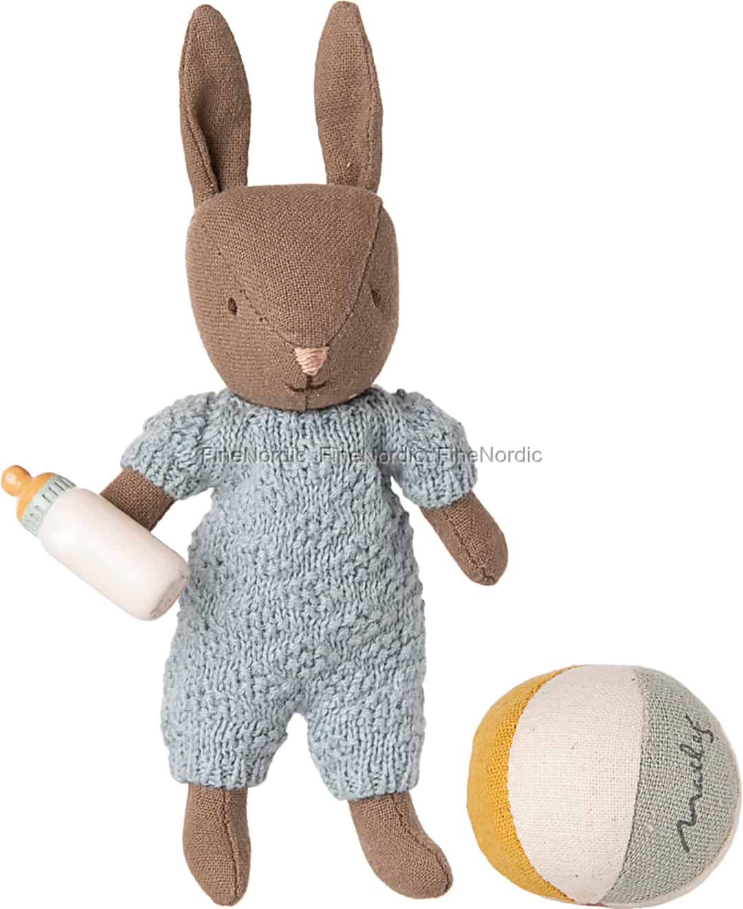 Discover the enchanting world of Maileg with this beautiful baby rabbit set. Dressed in the softest sky-blue knitted romper, this little friend is waiting for someone to love and care for it. With tiny magnets in its hands, it can hold its own bottle for feeding time or get ready for a game with its colourful striped ball. Every detail, from the hand-stitched nose to the floppy linen ears, is designed to inspire wonder and create moments of gentle, imaginative play.