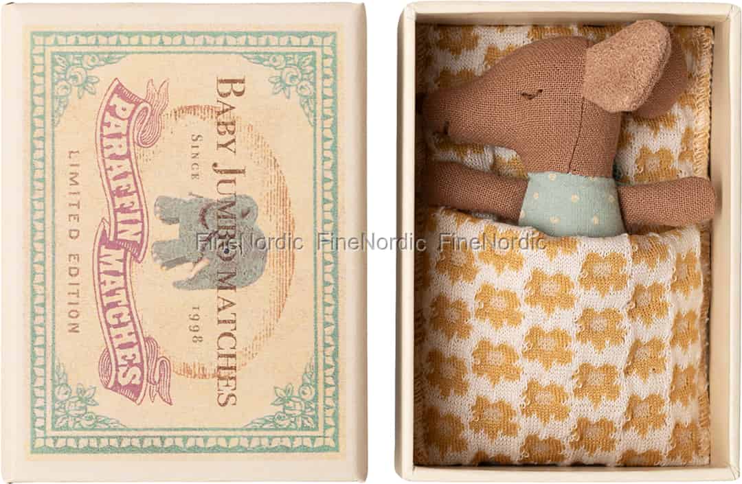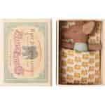 Discover the enchanting world of Maileg, where imagination lives in the smallest of details. This Sleepy Wakey Baby Mouse is a perfect introduction to that world, arriving in its very own matchbox bed. The box itself is a treasure, with vintage-inspired illustrations that hint at the magic within. Slide it open to find the sweetest baby mouse, nestled under a soft, floral-patterned sleeping bag, ready for every part of your child's day-long narrative.