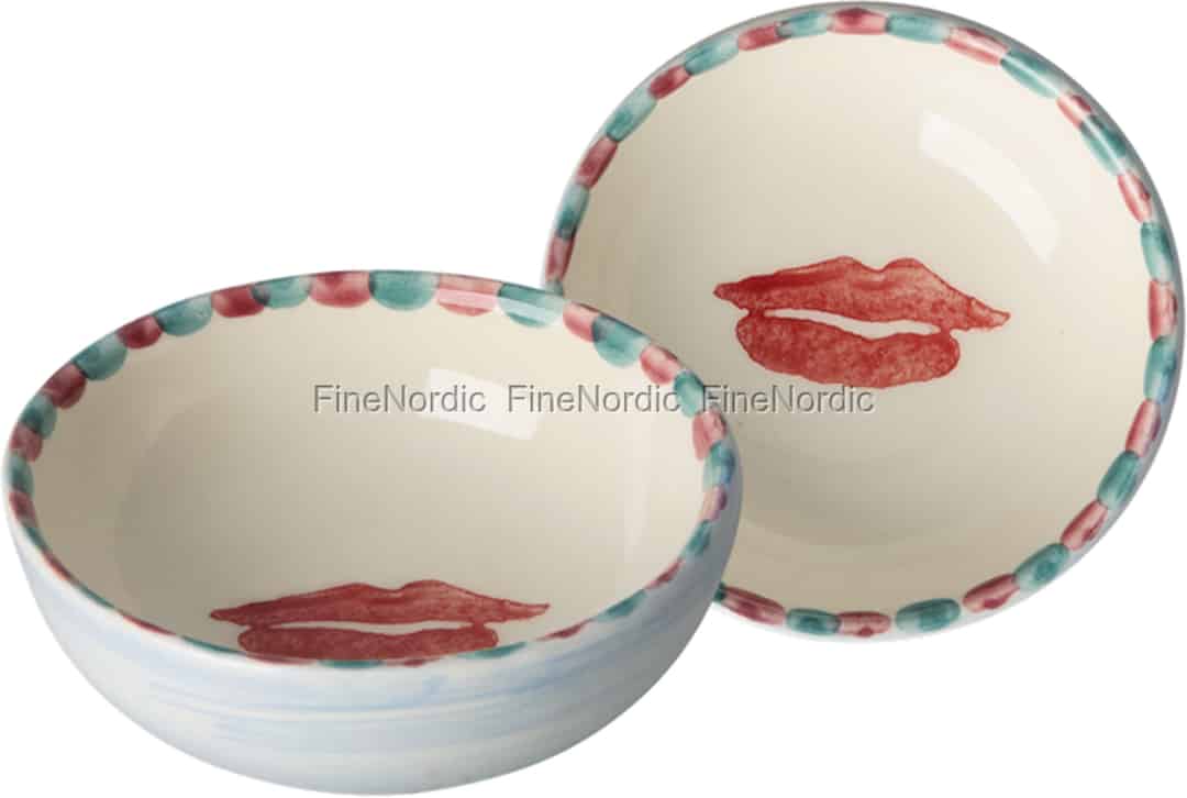From the creative world of Rice comes a small bowl with a big personality. This piece captures the essence of their 'everyday magic' philosophy, designed to bring colour and fun to your home. The glossy, off-white ceramic provides the perfect canvas for the playful, hand-painted red lips that seem to offer a cheerful greeting. Along the rim, a border of painted teal and pink beads adds a final, delightful flourish, while a gentle wash of light blue graces the exterior, giving it a soft, artisanal finish.