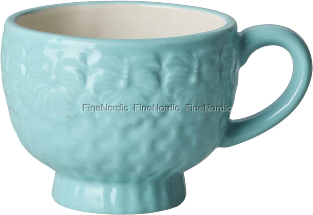 From the Danish brand Rice, this beautiful mug is a celebration of everyday happiness. The first thing you'll notice is the wonderfully tactile surface, where a band of stylised flowers is embossed into the ceramic. Coated in a soft, glossy mint glaze, it feels substantial and comforting in your hands. The rounded shape rests on a neat pedestal foot, a thoughtful detail that adds a touch of vintage character to its profile. It’s a piece designed not just to be seen, but to be held and enjoyed.