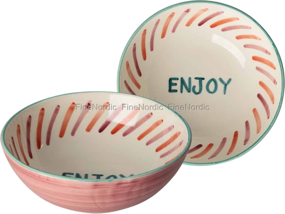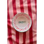 From the creative world of Rice comes a piece that truly embodies their philosophy of fun, funkiness, and functionality. This large ceramic bowl is a canvas of cheerful expression, from its softly textured pink exterior to the warm, radiant stripes that adorn its inner walls. Each brushstroke is a testament to the artisan's touch, creating a piece that feels personal and full of life. At its heart, the simple, hand-lettered word 'ENJOY' serves as a gentle nudge to pause and appreciate the good things in life.