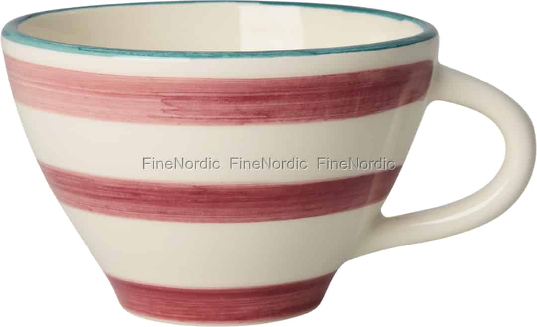 From the heart of Danish design, Rice brings you a ceramic tea cup that embodies their philosophy of fun, funkiness, and functionality. This piece is a celebration of colour and the beauty of imperfection. The warm, cream-coloured ceramic provides the perfect canvas for the vibrant, raspberry-pink stripes, each one applied by hand with an artist's touch. This is not just a cup; it is a small piece of art designed to bring a smile to your face and brighten up your kitchen shelves.