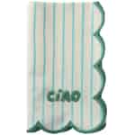 Bring a touch of playful Italian charm to your next gathering. This delightful cotton napkin, with its fresh mint stripes and cheerful 'ciao' greeting, is designed to make every meal feel like a special occasion.