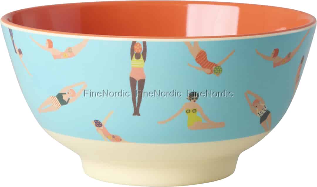 Bring the joyful energy of a vintage summer holiday to your home with this beautiful 'Retro Swimster' bowl by Rice. Each illustrated swimmer, poised to dive or float gracefully, tells a story of sun-warmed days and leisurely afternoons. The vibrant light blue exterior is wonderfully contrasted by the warm, surprising terracotta orange within, creating a piece that feels both playful and thoughtfully designed. It’s more than just a bowl; it’s a small celebration of colour and character, ready to brighten your tabletop.