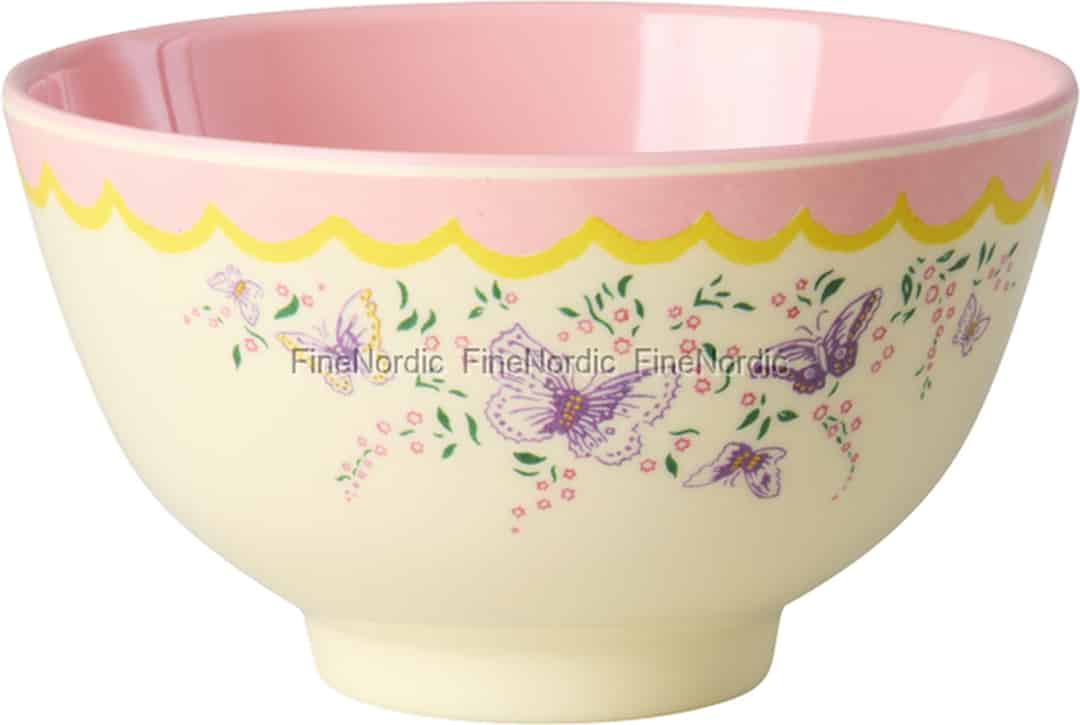 Let the gentle charm of a country garden flutter onto your table. The "Spread Your Wings" bowl from Rice is a celebration of simple pleasures, designed to make ordinary moments feel special. The creamy exterior provides a lovely canvas for delicate purple butterflies as they dance amongst tiny pink flowers and green sprigs. A sweet, scalloped border in pink and yellow frames the design, while the glossy pink interior adds a surprising pop of cheerful colour every time you take a spoonful. It's a design that tells a story of sunshine and gentle breezes.