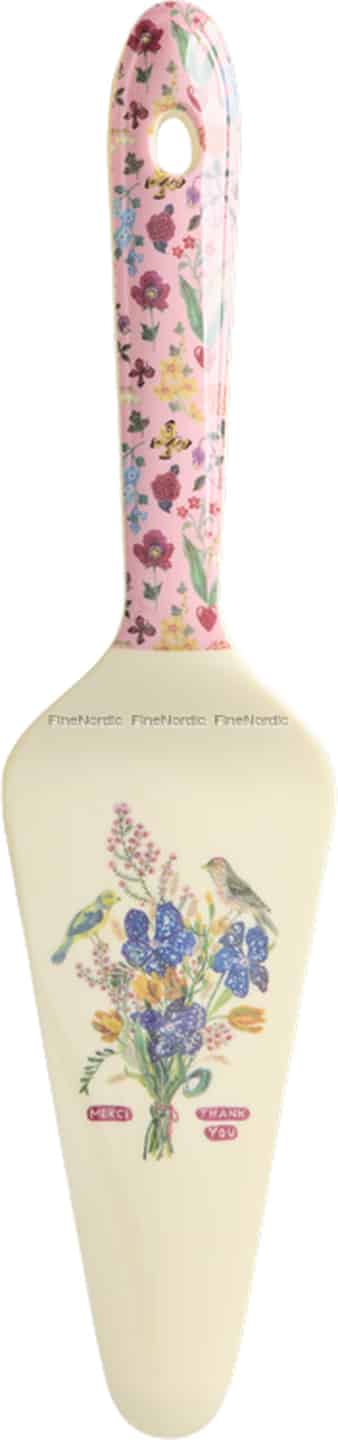 Discover the enchanting world of French artist Nathalie Lété with this beautiful melamine cake server from Rice. Each detail is designed to delight, from the charming birds perched on a floral bouquet to the tiny, thoughtful 'Merci' and 'Thank You' messages on the blade. The creamy base provides a perfect canvas for the artwork, while the handle bursts with a contrasting pink floral print, creating a piece that is as much a work of art as it is a functional kitchen utensil. It feels light yet sturdy in your hand, ready to serve up your favourite bakes.