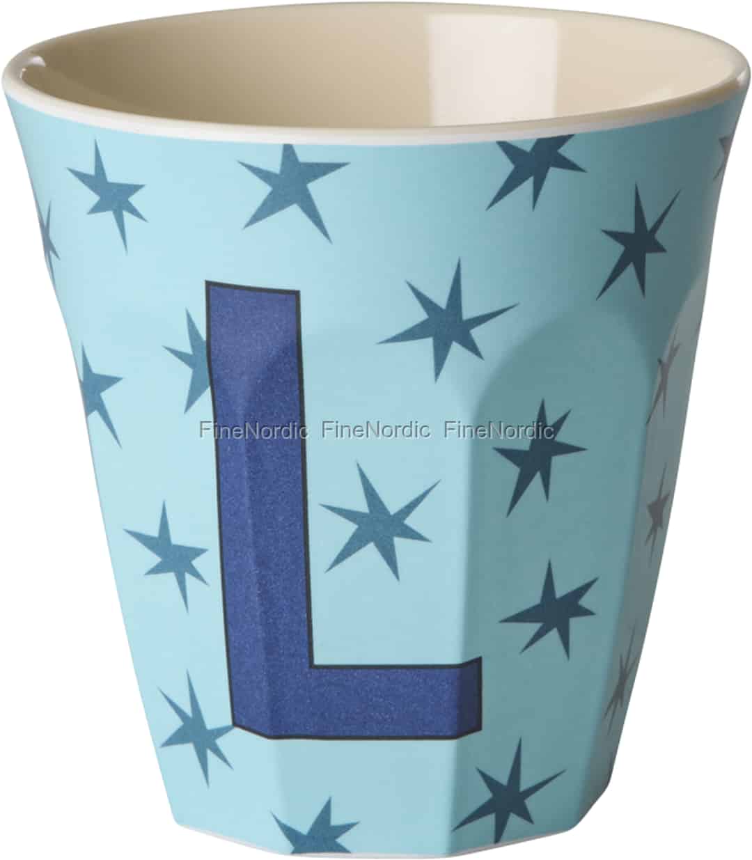Imagine a cheerful cup that's unmistakably yours. This delightful melamine cup from Rice brings a personal touch to your daily routine, with its bold initial and a sprinkle of deep blue stars against a serene blue sky.