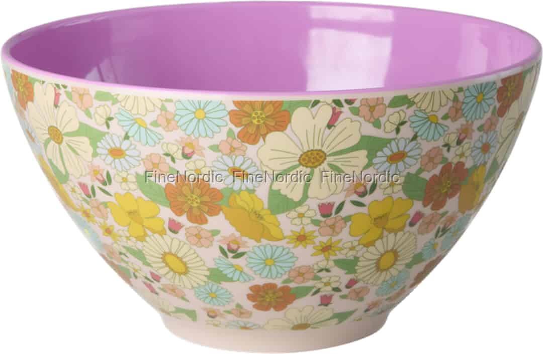 Embrace the playful spirit of Danish design with the 'Flower Power' salad bowl by Rice. Every meal becomes a small celebration when served from this wonderfully cheerful piece. Its exterior is a tapestry of retro-inspired florals, reminiscent of a sun-drenched wildflower meadow, instantly sparking conversation and smiles. The contrasting solid lavender interior adds a contemporary twist, creating a beautiful frame for fresh, vibrant salads or a medley of seasonal fruits.