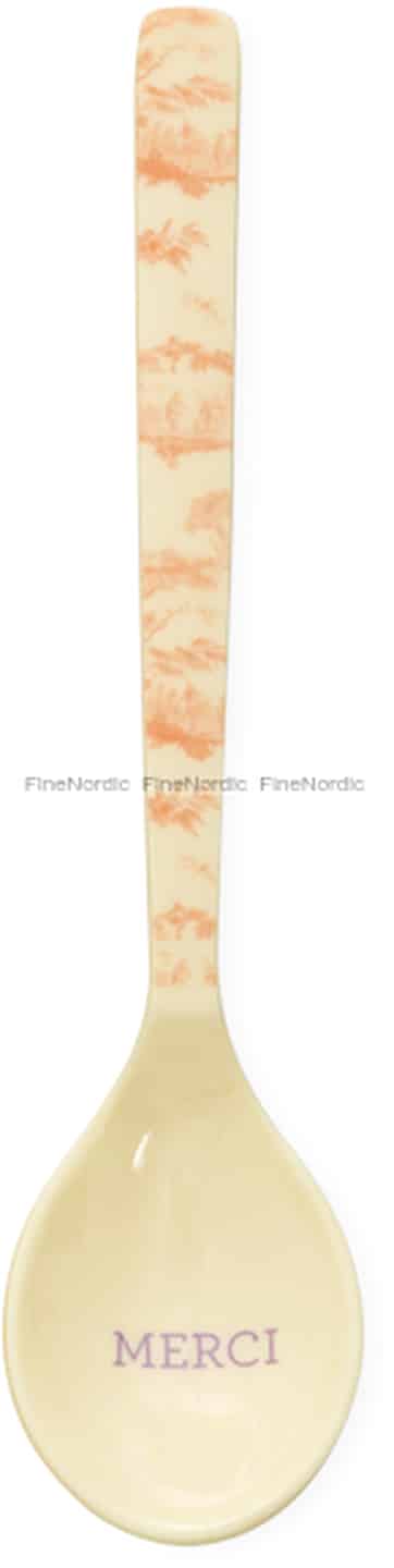 From the creative world of Rice comes a teaspoon that's more than just a utensil; it's a small piece of art for your table. The 'Glory Days' spoon is adorned with the beautiful 'Toile de rice' print, a soft orange pattern on a warm cream background that evokes the tranquil charm of the French countryside. Each time you pick it up, you'll notice the thoughtful details, from the glossy, smooth finish to the sweet 'Merci' waiting in the bowl. It’s a design that tells a story of simple elegance and appreciation.
