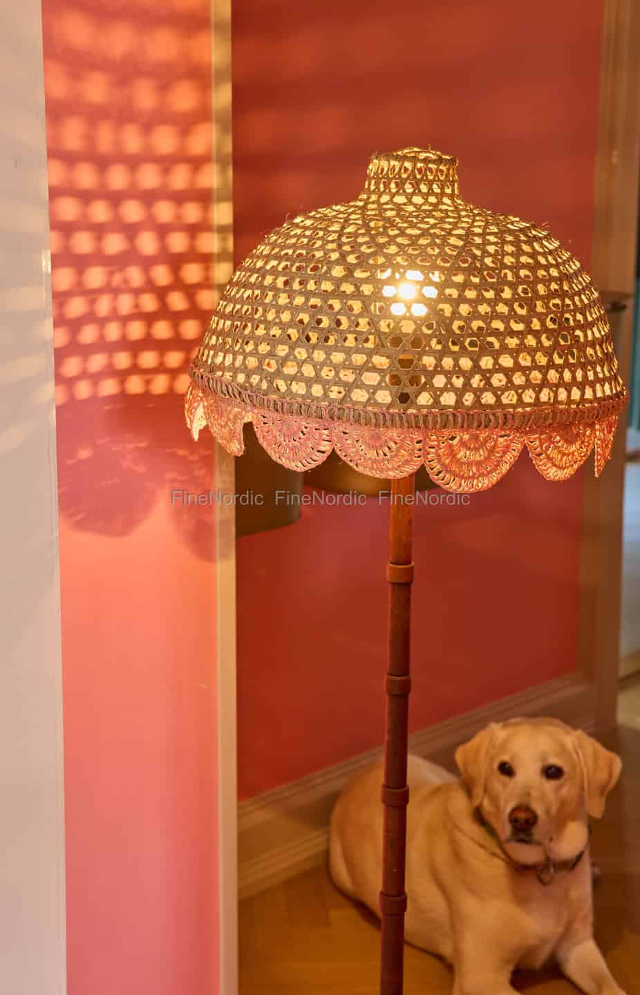 Discover the delightful artistry of this Rice lamp shade, where traditional weaving meets playful design. Each shade is carefully constructed from natural raffia, forming an open, airy pattern that feels both rustic and refined. Your eyes are immediately drawn to the whimsical border—a lovingly embroidered trim with crocheted-style scallops in a gentle soft pink. It's a piece that doesn't just hang in a room; it brings a story of craftsmanship and cheerful character with it.